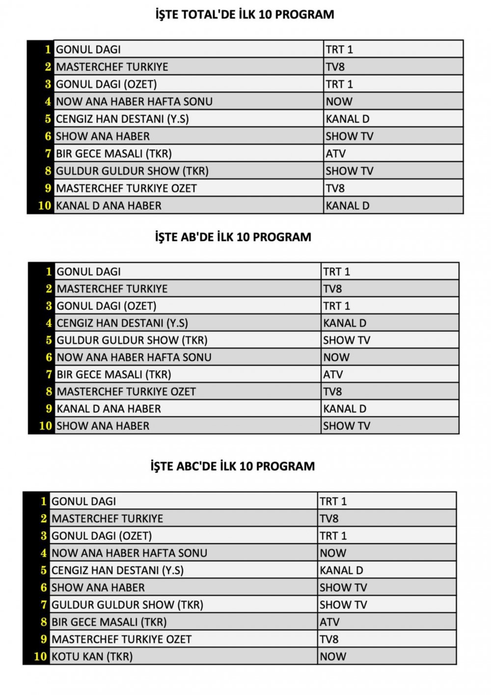 ABC’de 1. sırada “Gönül Dağı” , 2. sırada “MasterChef Türkiye”,3. sırada ise “Gönül Dağı” özet bölümü yer aldı.