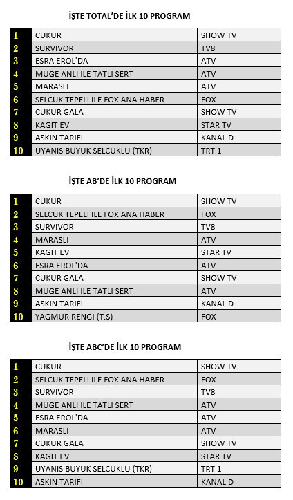 AB'de ise 1. sırada “Çukur”, 2. sırada “Selçuk Tepeli İle Fox Ana Haber”, 3. sırada “Survivor” yer aldı.