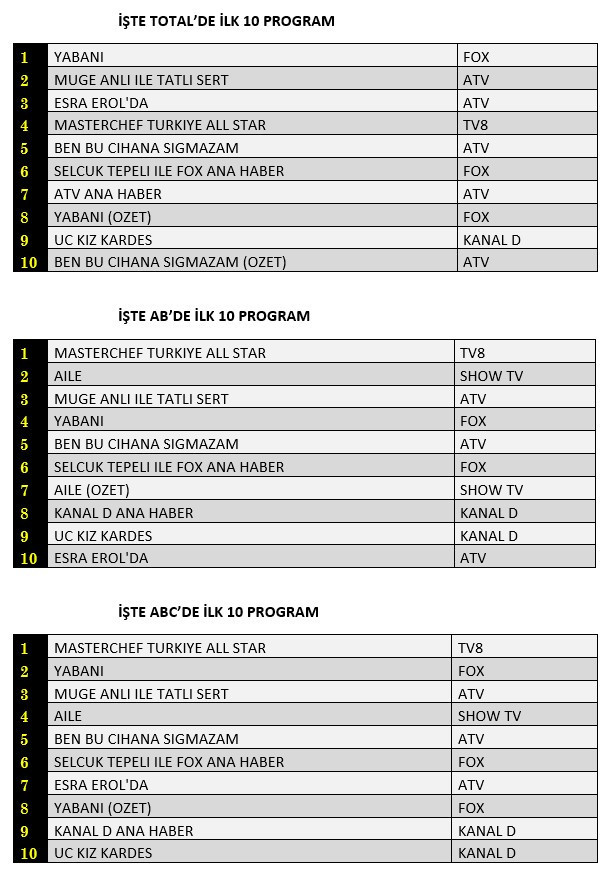 AB'de ise 1.sırada TV8’de ekrana gelen “Masterchef Türkiye All Star”, 2.sırada Show TV’de yayınlanan “Aile”, 3.sırada “Müge Anlı Tatlı Sert” yer aldı.