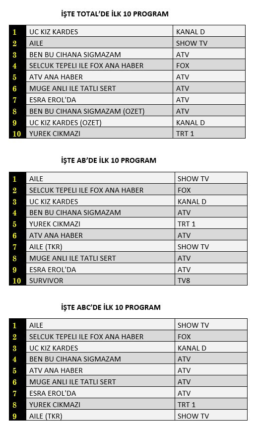 AB'de ise 1. sırada Show TV’nin yeni dizisi “Aile”, 2. sırada “Selçuk Tepeli İle Fox Ana Haber”, 3. sırada “Üç Kız Kardeş” yer aldı.