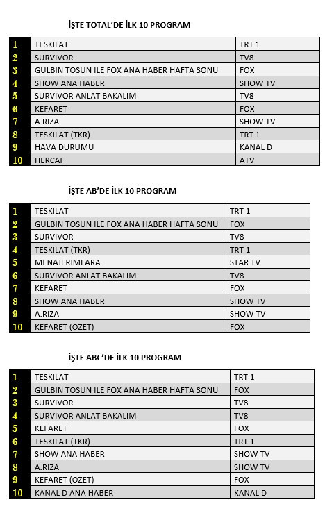 Total'de 1. sırada TRT1’de ilk bölümü ekrana gelen “Teşkilat”, 2. sırada TV8’de yayınlanan “Survivor”, 3. sırada “Gülbin Tosun İle Fox Ana Haber Hafta Sonu” yer aldı.