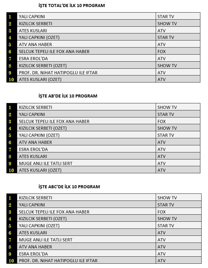 AB'de ise 1. sırada “Kızılcık Şerbeti”, 2. sırada “Yalı Çapkını”, 3. sırada “Selçuk Tepeli İle Fox Ana Haber” yer aldı.