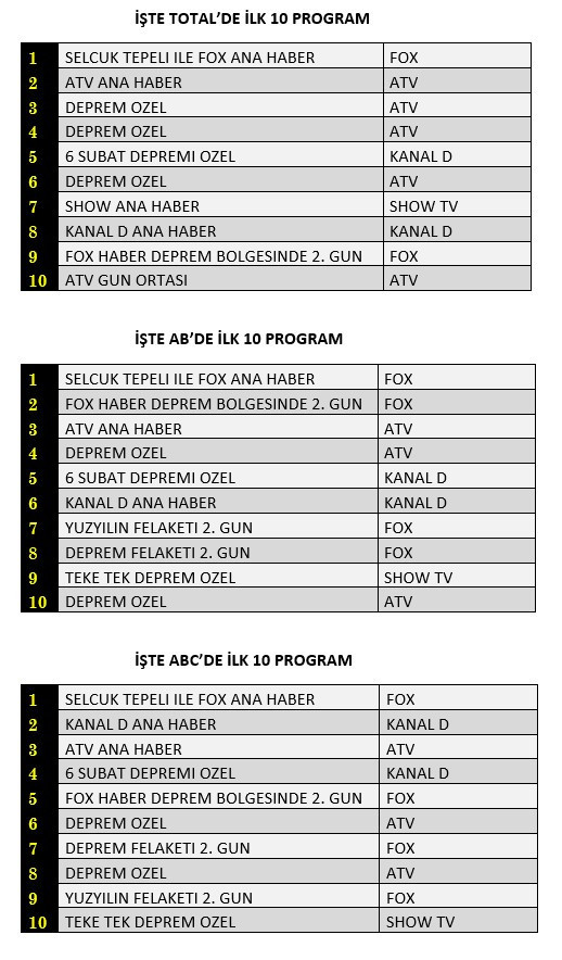 AB'de ise 1.sırada “Selçuk Tepeli İle Fox Ana Haber”, 2.sırada “Fox Ana Haber Deprem Bölgesinde 2. Gün”, 3.sırada “Atv Ana Haber” yer aldı.