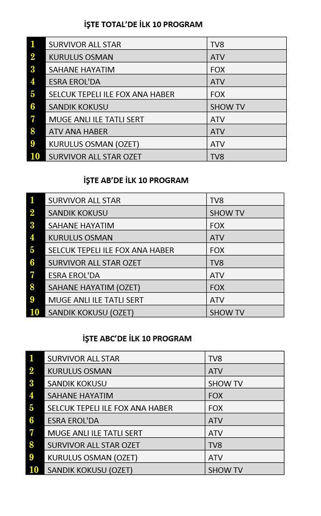 ABC'de ise 1.sırada TV8’de izleyiciyle buluşan “Survivor All Star”, 2. sırada Atv’de yayınlanan “Kuruluş Osman”, 3.sırada “Sandık Kokusu” yer aldı.