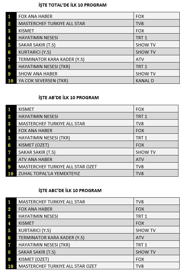 Total'de 1. sırada “Fox Ana Haber”, 2. sırada TV8’de yayınlanan “Masterchef Türkiye All Star”, 3. sırada Fox TV’de yayınlanan “Kısmet”, 4. sırada TRT1’in yeni dizisi “Hayatımın Neşesi” yer aldı.