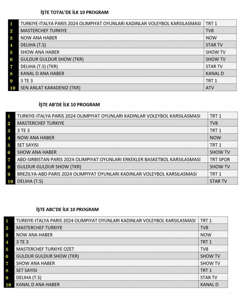 ABC'de ise 1.sırada “Türkiye-İtalya Paris 2024 Olimpiyat Oyunları Kadınlar Voleybol Karşılaşması”, 2.sırada “Masterchef Türkiye”, 3.sırada “Now Ana Haber” yer aldı.