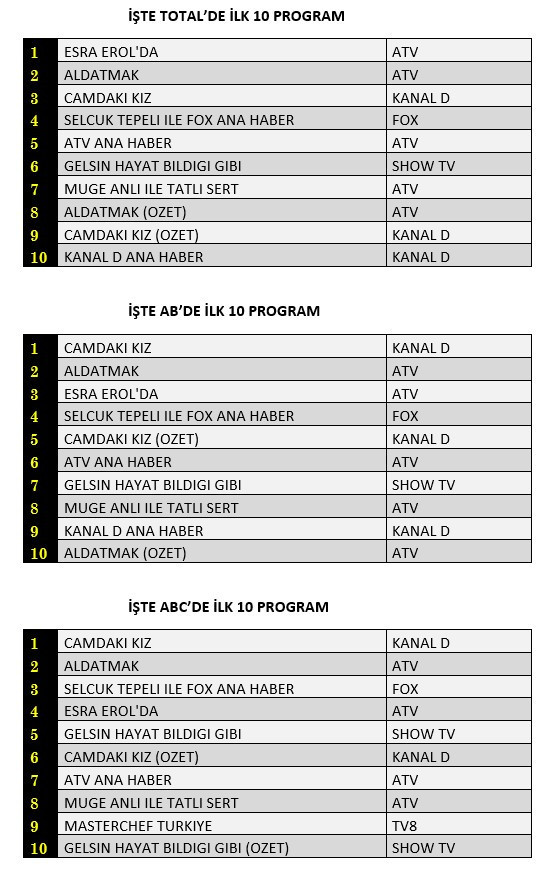 Total'de 1. sırada Atv’de izleyiciyle buluşan “Esra Erol’da”, 2. sırada Atv’de ekrana gelen “Aldatmak”, 3. sırada Kanal D’de yayınlanan “Camdaki Kız” yer aldı.