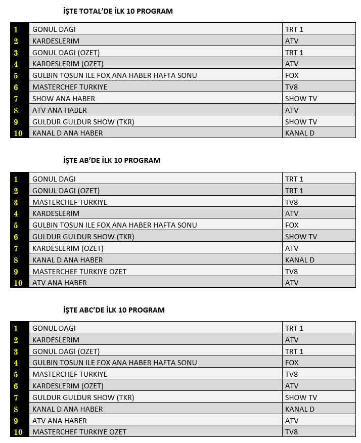 Total'de 1.sırada TRT1’de izleyiciyle buluşan “Gönül Dağı”, 2. sırada Atv’de ekrana gelen “Kardeşlerim”, 3.sırada “Gönül Dağı” dizisinin özeti yer aldı.