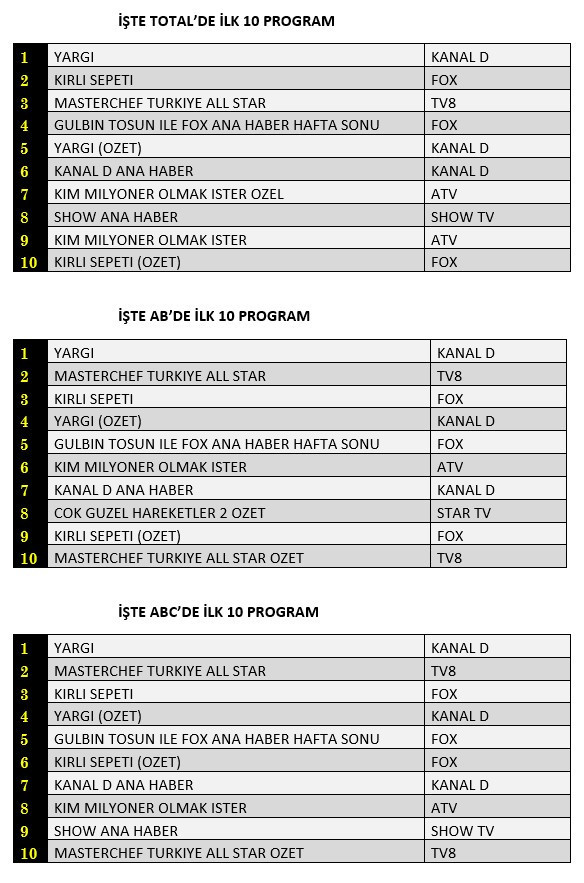 AB'de ise 1. sırada “Yargı”, 2. sırada Atv’de “Masterchef Türkiye All Star”, 3. sırada “Kirli Sepeti” yer aldı.