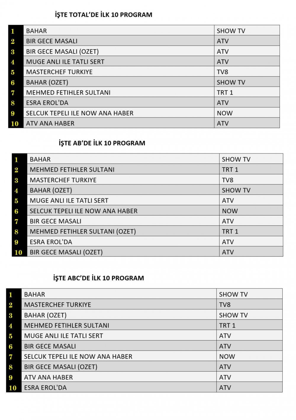 ABC'de ise 1.sırada “Bahar”, 2.sırada “Masterchef Türkiye”, 3.sırada “Bahar” dizisinin özeti yer aldı.