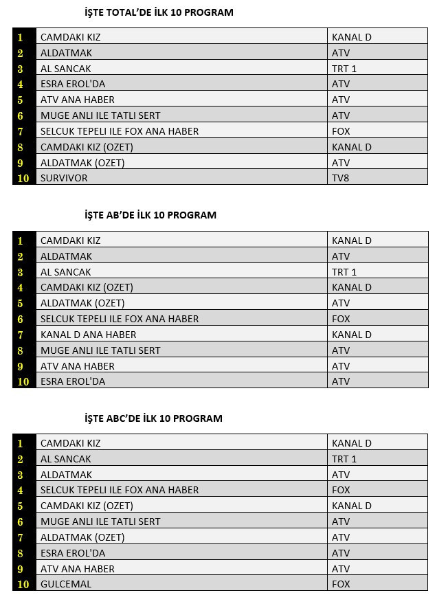 Kanal D'de yayınlanan "Camdaki Kız" Total'de reytinglerde birinci sırayı alırken, Atv'de gösterilen "Aldatmak" ikinci sırada yer aldı. TRT1'de yayınlanan "Al Sancak" ise üçüncü sırayı elde etti.