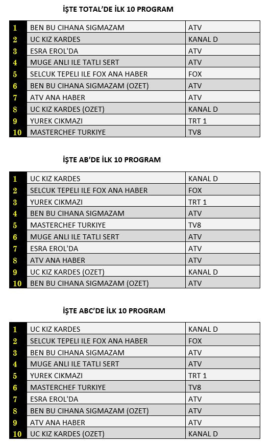 AB'de ise 1. sırada “Üç Kız Kardeş”, 2. sırada “Selçuk Tepeli İle Fox Ana Haber” 3. sırada TRT1’de ekrana gelen “Yürek Çıkmazı” yer aldı.