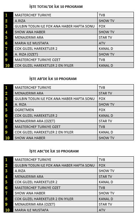 AB'de ise 1. sırada “Masterchef Türkiye”, 2. sırada Star TV’de yayınlanan “Menajerimi Ara”, 3. sırada “Gülbin Tosun İle Fox Ana Haber Hafta Sonu” yer aldı.