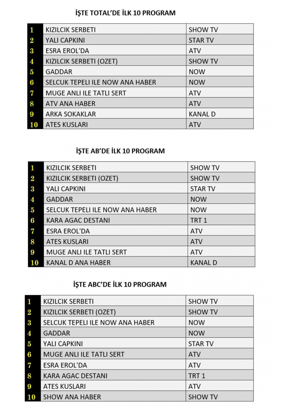 Total'de 1.sırada“Kızılcık Şerbeti”, 2. sırada “Yalı Çapkını”, 3.sırada “Esra Erol’da” yer aldı.