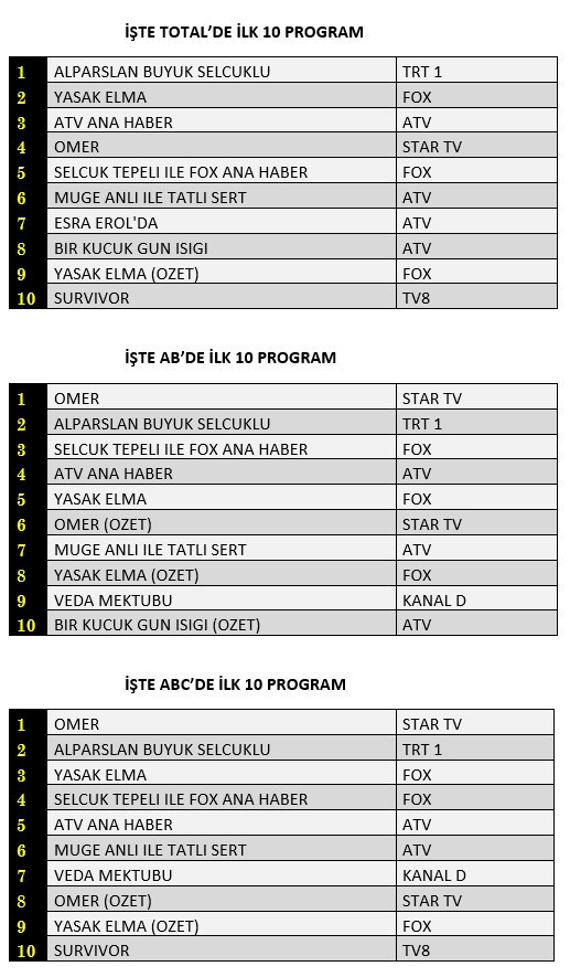 AB'de ise 1.sırada Star TV’de yayınlanan “Ömer”, 2.sırada “Alparslan Büyük Selçuklu”, 3.sırada “Selçuk Tepeli İle Fox Ana Haber” yer aldı.