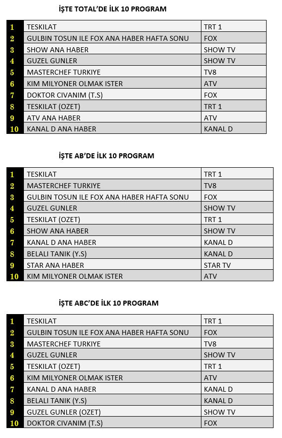 AB'de ise 1.sırada “Teşkilat”, 2.sırada TV8’de ekrana gelen “Masterchef Türkiye”, 3.sırada “Gülbin Tosun İle Fox Ana Haber Hafta Sonu” yer aldı.