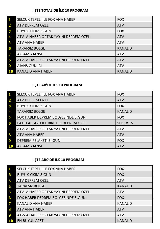 Total'de ve AB’de 1.sırada “Selçuk Tepeli İle Fox Ana Haber”, 2. sırada “Atv Deprem Özel”, 3.sırada Fox TV’de ekrana gelen “Büyük Yıkım 3. Gün” yayını yer aldı.