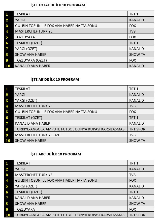 Total'de 1. sırada TRT1’de izleyiciyle buluşan “Teşkilat”, 2. sırada Kanal D’de ekrana gelen “Yargı”, 3. sırada “Gülbin Tosun İle Fox Ana Haber Hafta Sonu” yer aldı.
