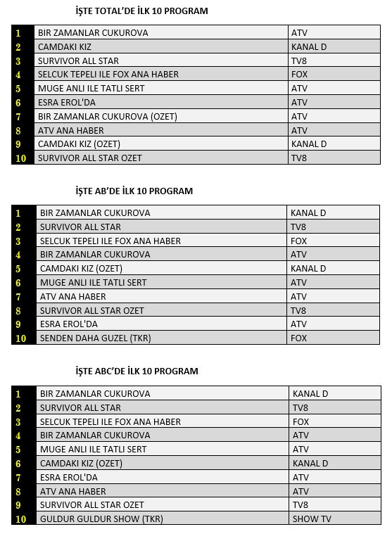 AB'de ise 1. sırada “Bir Zamanlar Çukurova”, 2. sırada “Survivor All Star” 3. sırada “Selçuk Tepeli İle Fox Ana Haber” yer aldı.