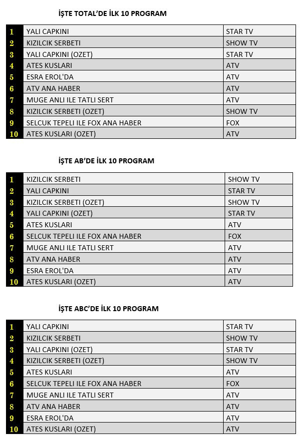Total'de 1. sırada Star TV’de izleyiciyle buluşan “Yalı Çapkını”, 2. sırada Show TV’de yayınlanan “Kızılcık Şerbeti”, 3. sırada “Yalı Çapkını” dizisinin özeti yer aldı.