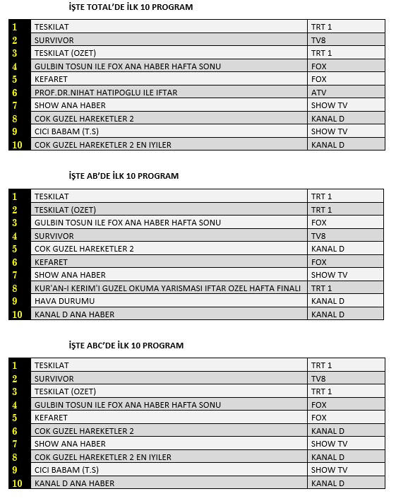 Total'de 1. sırada TRT1’de ekrana gelen “Teşkilat”, 2. sırada TV8’de yayınlanan “Survivor”, 3. sırada “Teşkilat” dizisinin özeti yer aldı.