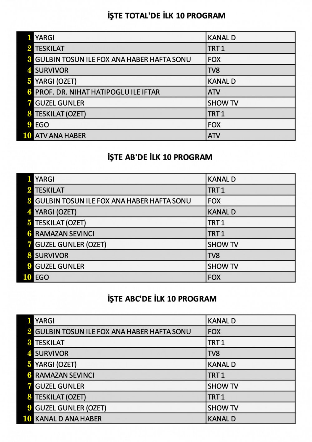 Total’de 1. sırada Kanal D’de izleyici ile buluşan “Yargı”, 2. sırada TRT 1’de ekranlara gelen “Teşkilat”, 3. sırada ise “Gülbin Tosun ile FOX Ana Haber Hafta Sonu” yer aldı.