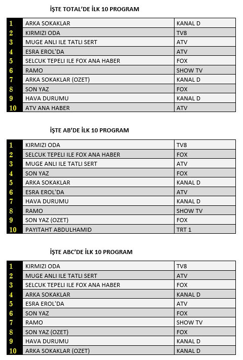 Total'de 1. sırada Kanal D’de ekrana gelen “Arka Sokaklar”, 2. sırada TV8’de yayınlanan “Kırmızı Oda”, 3. sırada ATV’de izleyiciyle buluşan “Müge Anlı İle Tatlı Sert” programı yer aldı.