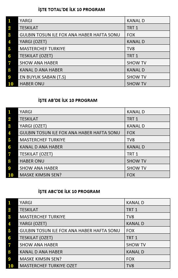 Total'de 1. sırada Kanal D’de yayınlanan “Yargı” 2. sırada TRT1’de yayınlanan “Teşkilat”, 3. sırada “Gülbin Tosun İle Fox Ana Haber Hafta Sonu” yer aldı.