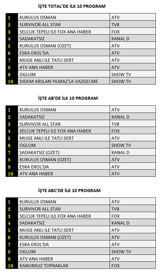 Total'de 1. sırada ATV’de yayınlanan “Kuruluş Osman” 2. sırada TV8’de ekrana gelen “Survivor All Star”, 3. sırada “Selçuk Tepeli İle Fox Ana Haber” yer aldı.