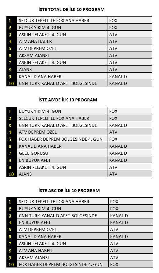 AB'de ise 1.sırada Fox TV’de ekrana gelen “Büyük Yıkım 4. Gün", 2.sırada “Selçuk Tepeli İle Fox Ana Haber”, 3.sırada Kanal D’de ekrana gelen “CNN Türk-Kanal D Afet Bölgesinde” yayını yer aldı.