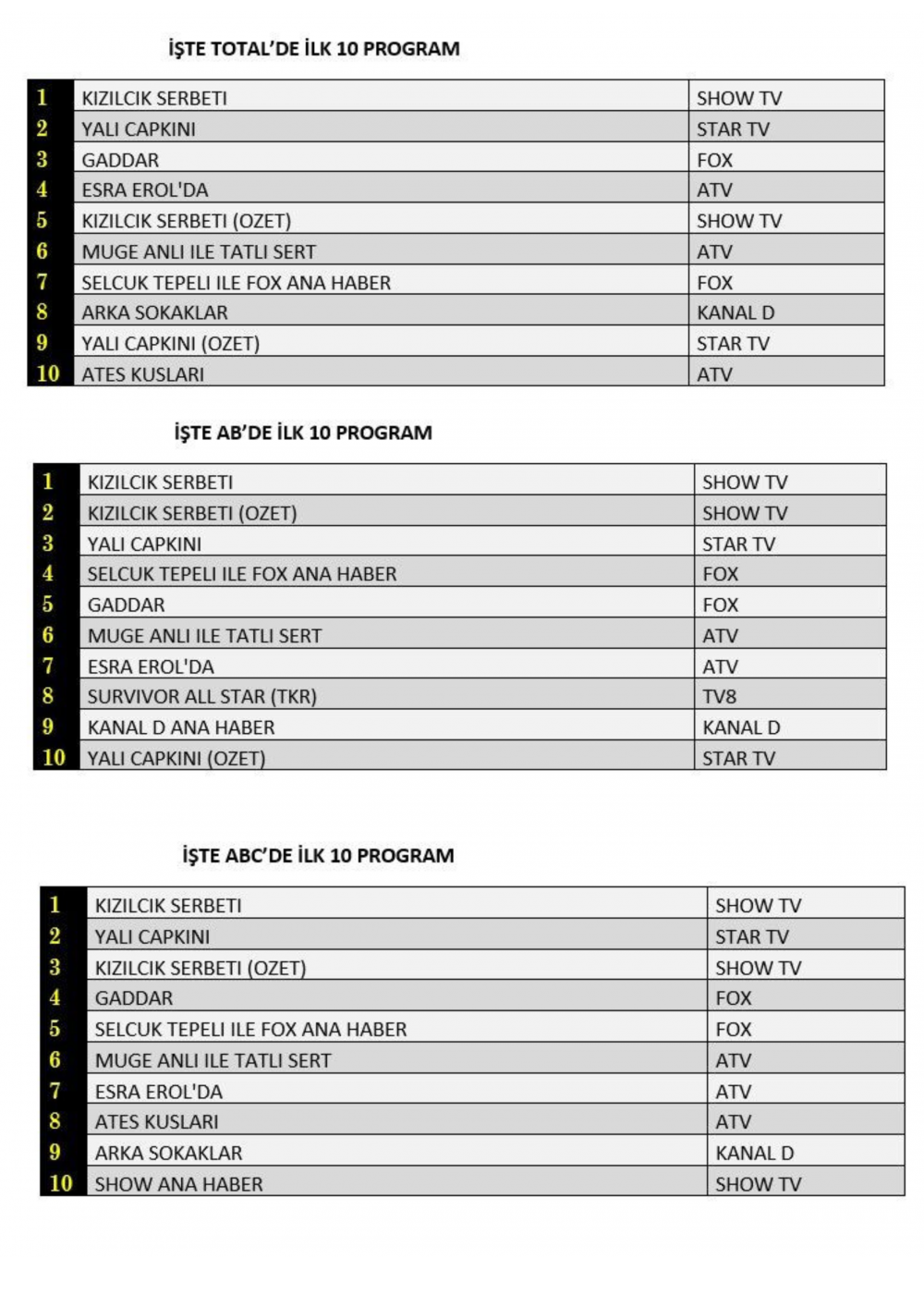 Total'de 1.sırada Show TV’de izleyiciyle buluşan “Kızılcık Şerbeti”, 2. sırada Star TV’de yayınlanan “Yalı Çapkını”, 3.sırada Fox TV’de ekrana gelen “Gaddar” yer aldı.