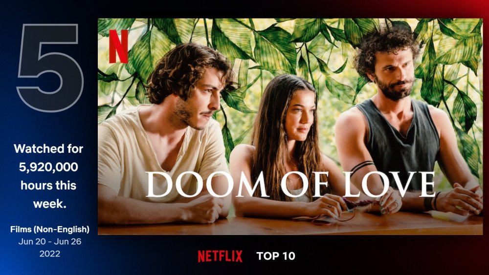 top10.netflix.com/ adresinden haftalık izlenme sayılarını açıklamaya devam eden Netflix, 20-26 Haziran verilerini de açıkladı. 20 Haziran'da yayınlanan Aşkın Kıyameti (Doom of Love), geçen hafta 5,920,000 saat izlenerek Netflix'in Dili İngilizce Olmayan Filmleri listesine 5. sıradan girdi.