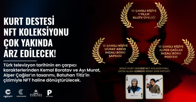 Türkiye’nin en çok izlenen ve merakla takip edilen yapımlarından “BÖRÜ”, NFT dünyasında yankı uyandırmaya devam ediyor. CaglarArts Insignia İş Ortaklığı ile Capital Block arasında imzalanan anlaşma uyarınca arz edilen NFT koleksiyonlarının üçüncü parçası da BÖRÜ tutkunlarıyla buluşuyor. Kurt Destesi’nin ilk iki kartından oluşan toplam 20 parçalık üçüncü NFT koleksiyonu, NFTPrime üzerinden 8 Mart Salı günü saat 20:39’da arz edilecek.