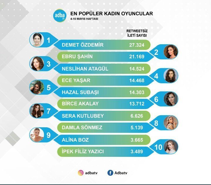 Adba TV’nin ‘En Popüler Kadın Oyuncular’ isimli anket çalışmasında, 4-10 Mayıs haftası için birinci sırada Demet Özdemir yer aldı. Retweetsiz ileti sayısının değerlendirildiği bu çalışmada Demet Özdemir için 27 bin 324 ileti paylaşıldı ve oyuncu birinciliği elde etti.
