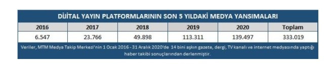Medya Takip Merkezi, günden güne kullanıcı sayısı ve popülaritesi artan dijital yayın platformlarının medya yansımalarını ele aldı. Kısmi kullanıcılara sahip olan tüm dijital yayın platformları, 2016 yılında; yazılı basın, görsel basın ve internet medyasında toplam 6 bin 547 haberde yer aldı. 2017 yılında tüm dijital yayın platformları ile ilgili haberler neredeyse 4 katına çıkarak 23 bin 766 habere konu oldu.