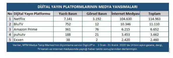 Netflix’i ikinci sırada 11 bin 110 haberde yer alan BluTV takip etti. MTM’nin hazırladığı listenin üçüncü sırasında 6 bin 652 haber ile Amazon Prime yer alırken, 3 bin 662 habere adını yazdıran puhutv listede dördüncü sırada yer aldı. Listenin beşinci sırasında 2020 yılında henüz yayın hayatına başlamayan Exxen 2 bin 460 haber ile yer aldı.