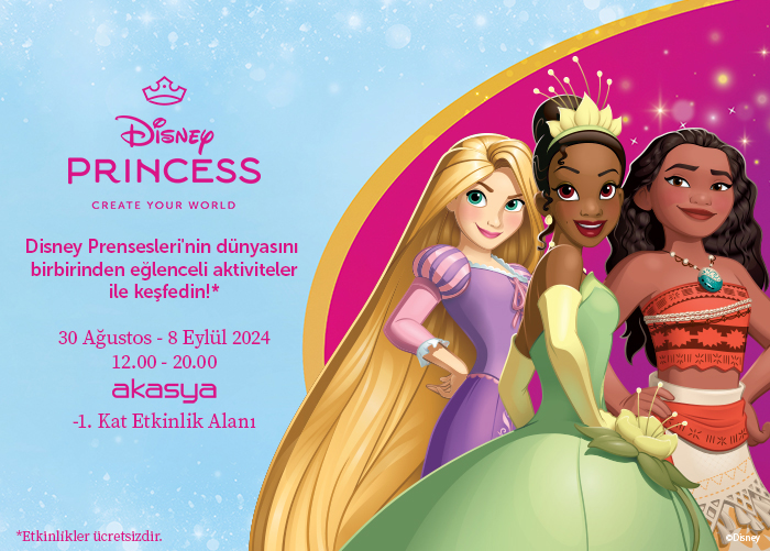 Disney hayranları 30 Ağustos Cuma’dan 8 Eylül Pazar’a kadar İstanbul, Akasya AVM’de Disney Prensesleri’nin sihirli dünyasını keşfetme fırsatı bulacak. Bu özel etkinlikte, Disney Prensesleri’nden ilham alınarak hazırlanan interaktif atölyelerin yanı sıra, Disney+ içeriklerinin izlenebileceği ve eğlenceli fotoğraf çekimlerinin yapılabileceği alanlar da yer alacak.