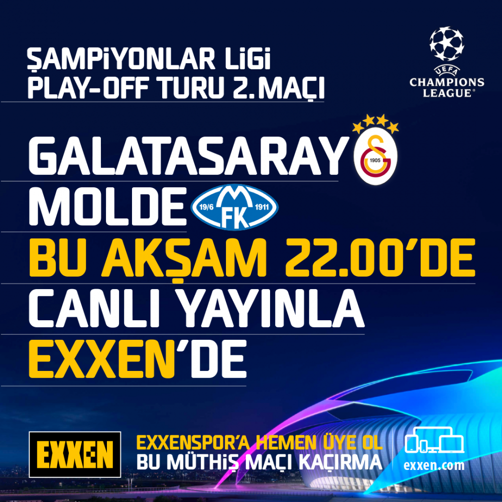 Temsilcimiz Galatasaray, UEFA Şampiyonlar Ligi Play-Off Turu ikinci maçında Molde ile karşılaşıyor. Ali Sami Yen Spor Kompleksi'nde oynanacak maç, bu akşam saat 22.00'de canlı yayınla Exxen’de.