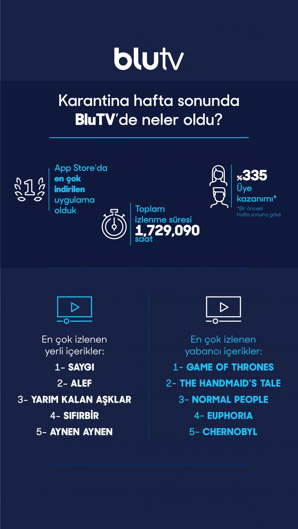 Bu süreçte BluTV özel yapımlarından sırasıyla ‘Saygı’, ‘Alef’, ‘Yarım Kalan Aşklar’, ‘Sıfır Bir’ ve ‘Aynen Aynen’ seyirci tarafından en çok tercih edilen yerli içeriklerden olurken, yabancı yapımlardan ‘Game of Thrones’, ‘The Handmaid’s Tale’, ‘Normal People’, ‘Euphoria’ ve ‘Chernobyl’ seyircilerin yoğun ilgisiyle karşılaştı.