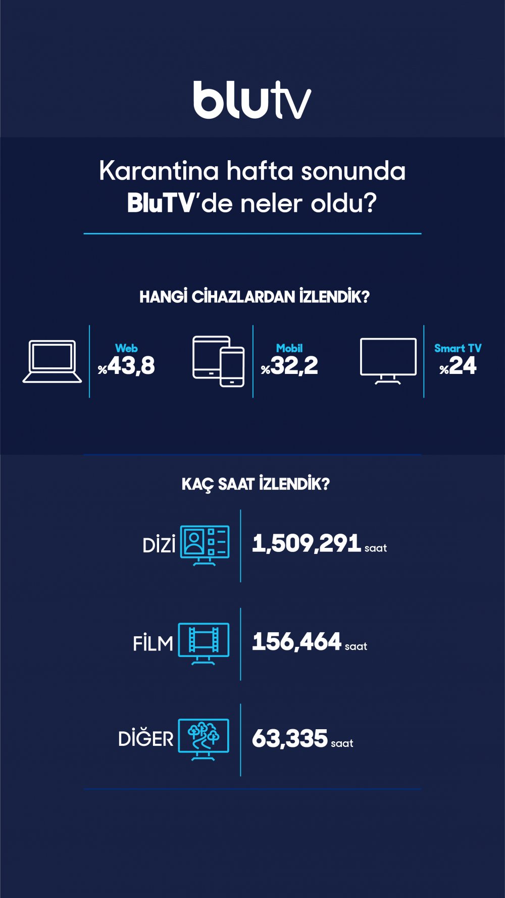 Bunun yanı sıra BluTV içerikleri, ziyaretçilerin %43,8’i tarafından Web’den, %32,2’si tarafından mobilden, %24’ü tarafından ise Smart TV’den takip edildi. Hafta sonu boyunca BluTV’de toplam 1,509,291 saat dizi ve 156,464 saat film izlendi. BluTV’de yer alan dizi ve film harici içerikler ise seyirciler tarafından toplam 63,335 saat boyunca tercih edildi.