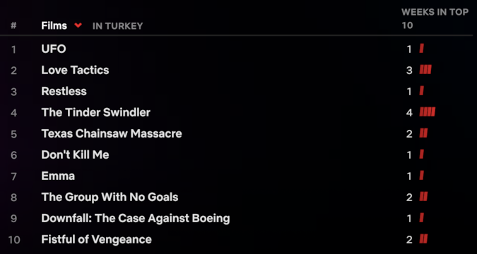 Film kategorisinde ise İpek Filiz Yazıcı'nın hayat verdiği müzik tutkunu Deniz ile Mert Ramazan Demir'in oynadığı motosiklet yarışçısı Ese'nin aşkını anlatan UFO zirvede yer aldı. Film, 4 milyon saatten fazla izlenerek globalde dili İngilizce olmayan filmler kategorisinde altıncı sırada yer aldı. Aynı listede dördüncü olan Aşk Taktikleri ise Netflix Türkiye'de UFO'nun arkasında kalarak ikinci oldu.