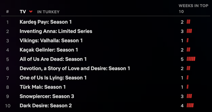Listedeki ilk haftasında 80 milyon saat izlenerek globalde en çok izlenen ikinci dizi olan Vikings: Valhalla, Netflix Türkiye'de ancak üçüncü sırada kendisine yer bulabildi. Okulda ceza alınca bir araya gelen apayrı karakterlerdeki beş liselinin sadece dördünün hayatta kalmasıyla yaşananları konu alan One of Us Is Lying (Birimiz Yalan Söylüyor) ve Binnur Kaya ile Şafak Sezer'in canlandırdığı Abiye-Erman çiftinin mutsuz ve trajik evliliklerinin anlatıldığı komedi dizisi Türk Malı'nın ilk kez yer aldığı "Netflix Türkiye'de en çok izlenen diziler" listesinin tamamına aşağıdan ulaşabilirsiniz.