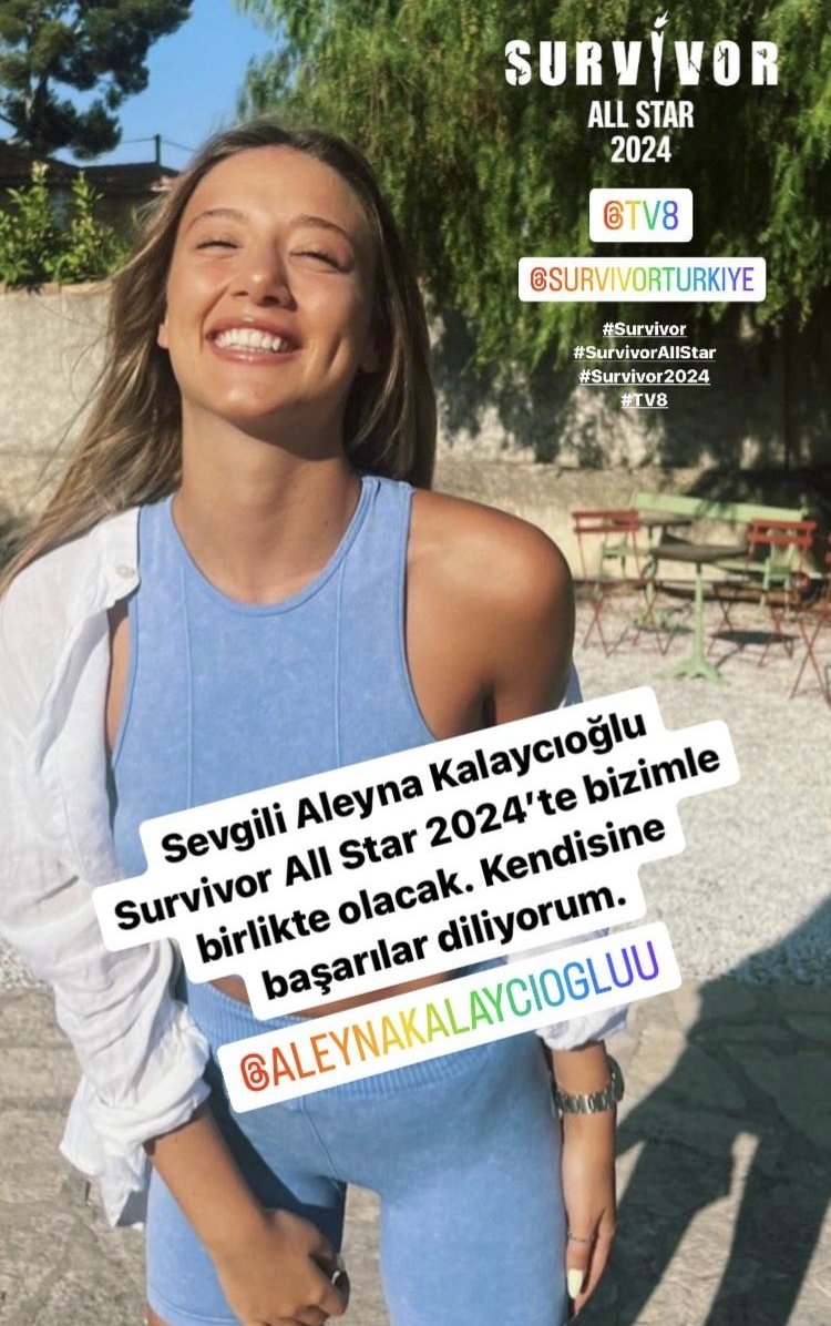 Survivor All Star 2024'ün dördüncü yarışmacısı ise Aleyna Kalaycıoğlu oldu. Survivor 2021 gönüllüler takımında yer alan Kalaycıoğlu'nun bir kez daha Survivor'da yarışacağını sosyal medya hesabından duyuran Acun Ilıcalı, şu ifadeleri kullandı: "Sevgili Aleyna Kalaycıoğlu Survivor All Star 2024'te bizimle birlikte olacak. Kendisine başarılar diliyorum."