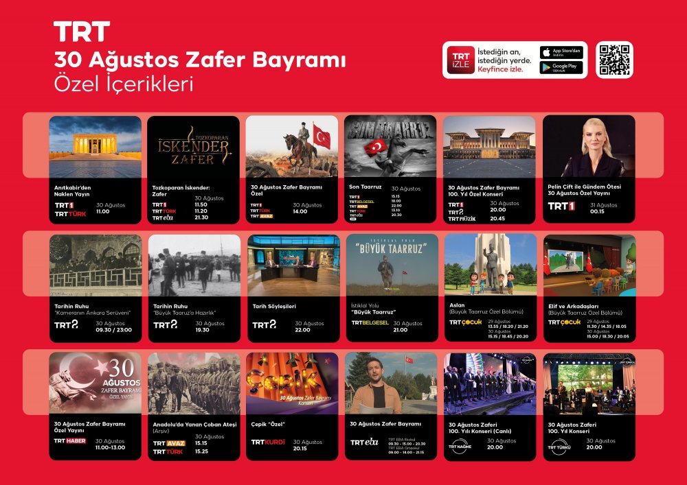 TRT Avaz ve TRT Türk ekranlarında ise “30 Ağustos Zafer Bayramı Özel Yayını” ile “Son Taarruz” belgeseli izleyiciyle buluşacak. TRT Kürdi ekranlarında “Çepik” programının özel bölümünde 30 Ağustos Zafer Bayramı Konseri’ne yer verilecek.