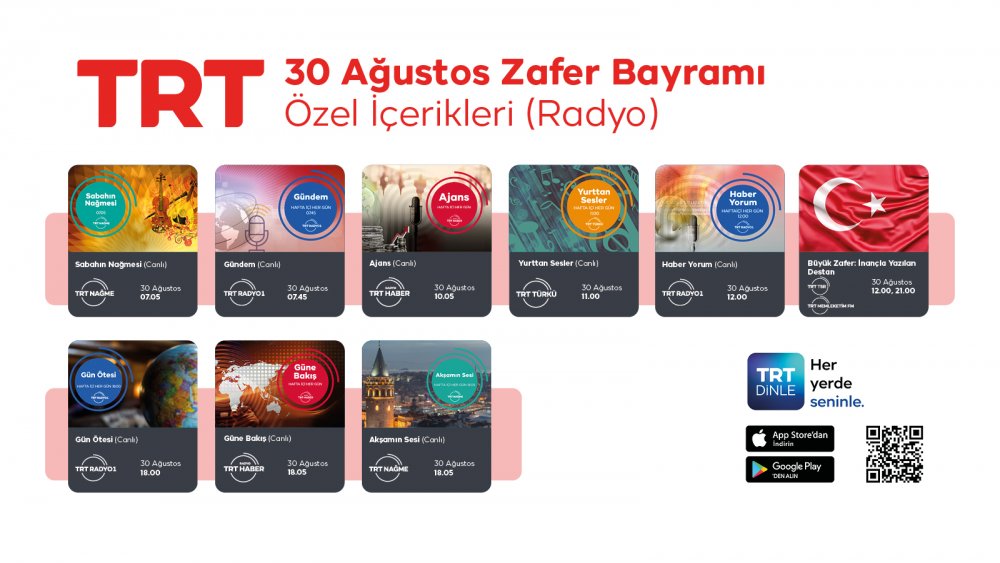 Tarihimizin en önemli dönüm noktalarından olan ve Gazi Mustafa Kemal Atatürk’ün başkumandanlığında kazanılan 30 Ağustos Zaferi’ni anmak amacı ile hazırlanan özel içerikler, TRT’nin ekran ve radyolarında izleyici ve dinleyiciyle buluşacak. Anıtkabir’den canlı yayınlar ve 30 Ağustos Büyük Zafer’i anlatan programlarla 30 Ağustos Zafer Bayramı’nın 101. yıl dönümü coşkuyla kutlanacak.