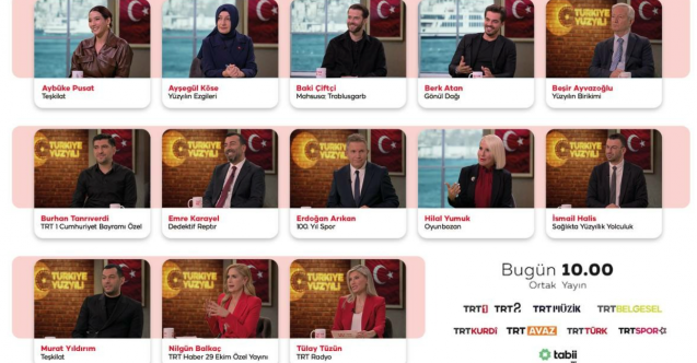 TRT tarafından Cumhuriyet’in 100. yılına özel olarak hazırlanan yapım ve içeriklerinin sevilen ekran yüzleri ve oyuncuları “TRT’de 100. Yıl” adlı programla bugün saat 10.00’da ortak yayınla TRT 1, TRT 2, TRT Müzik, TRT Belgesel, TRT Kurdi, TRT Avaz, TRT Türk ve TRT Spor Yıldız’da ekranlara gelecek.