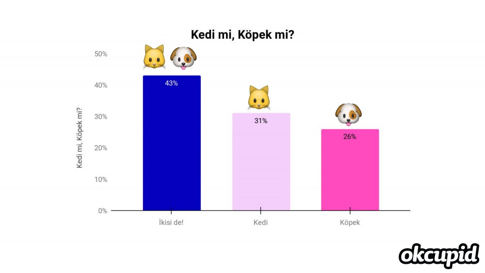 Neticede belli başlı hayvanlar evcil hayvan olarak sahiplenilebiliyor. Dünyanın geneli kedi ve köpek insanları olarak ikiye ayrılıyor. OkCupid’in bir diğer sorusu da “Kedi insanı mısın yoksa köpek insanı mı?”. Soruyu yanıtlayanların ise neredeyse yarısı (%43) “Her ikisi de” cevabını veriyor. “Hiçbiri diyenlerin oranı sadece yüzde 4. Kedi ve köpek tercihinde ise kazanan yüzde 5’lik bir farkla köpekler. Kadınlar kedi ve köpekleri eşit oranda tercih ederken erkekler yüzde 7’lik bir farkla köpekleri daha çok sevdiklerini belirtiyorlar. Ayrıca sorulara cevap veren insanların 4’te 1’i profil fotoğrafında köpek olmasını oldukça etkileyici bulduklarını da söylüyorlar.